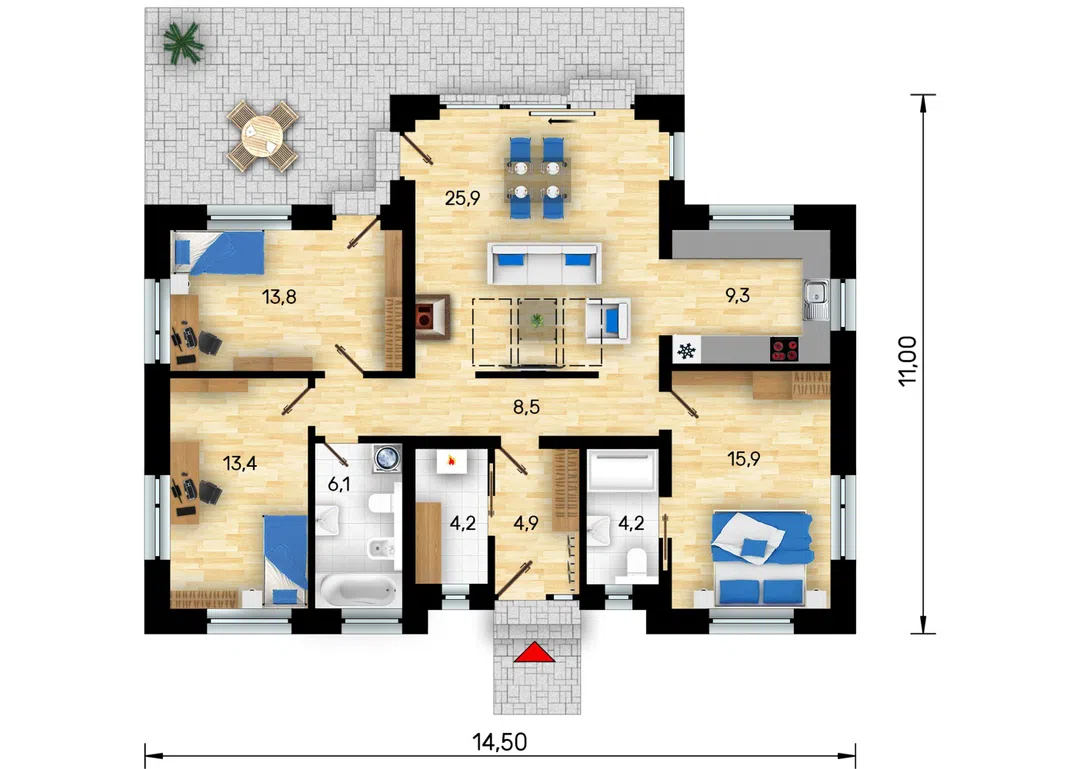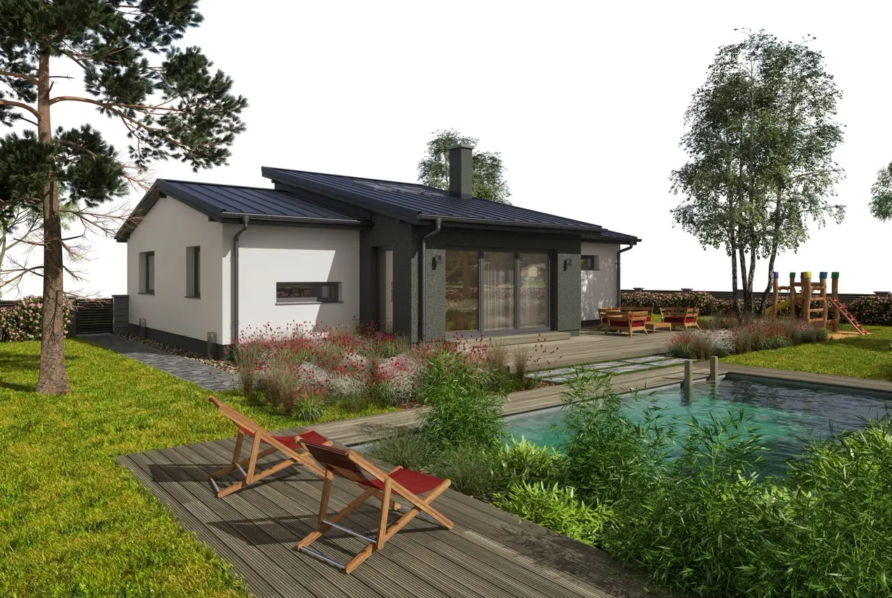 Jednopodlažní Danar je architektonicky moderní dům určený primárně pro mladou rodinu. Dominantním prvkem interiéru je otevřený obývací pokoj s prostorem do sešikmeného krovu. Dům je navržen pro osazení na rovinné nebo mírně svažité pozemky. Pro splnění legislativních požadavků na průkaz energetické náročnosti budovy je v tomto projektu navržen rekuperační výměník, využívající energii z teplé odpadní vody.